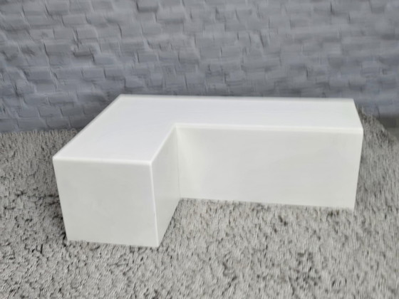 Tavolino a L minimalista di design italiano degli anni '80, realizzato in bianco e dotato di ruote per una facile mobilità. Fortemente influenzato dall'estetica Space Age, questo versatile pezzo può essere utilizzato come tavolino o tavolino basso. La geometria pulita e il design pratico riflettono il modernismo italiano di fine XX secolo, in cui forma e flessibilità sono fondamentali. Un'affermazione di design pura e sobria. Dimensioni: Altezza 35 Larghezza 105 Profondità 35-70 cm.