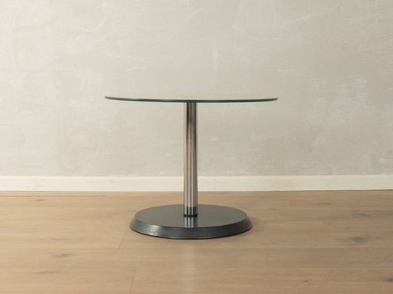 Tavolino classico degli anni '80. Struttura in metallo cromato con piano in vetro e base in metallo.