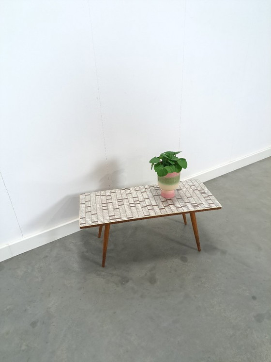 Tavolo vintage. Il tavolo ha gambe in legno inclinate e un piano in formica con pannelli color grigio, marrone e crema. Il tavolo è realizzato in Germania da Opal Kleinmöbel. È ideale come tavolino da caffè, tavolino laterale o portavasi.