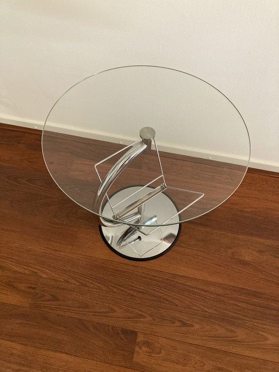 Tavolino di design vintage Kokoon con portariviste. Prodotto in Germania negli anni '80. Il vetro è in perfette condizioni, senza graffi, ma la cromatura nella parte inferiore della gamba è leggermente ossidata.