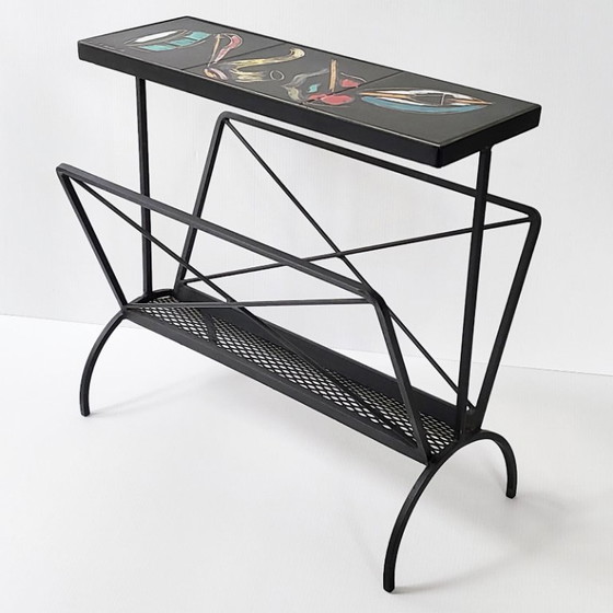 Tavolino laterale portariviste vintage anni '50 in ceramica e acciaio, anni '50, musica anni '50