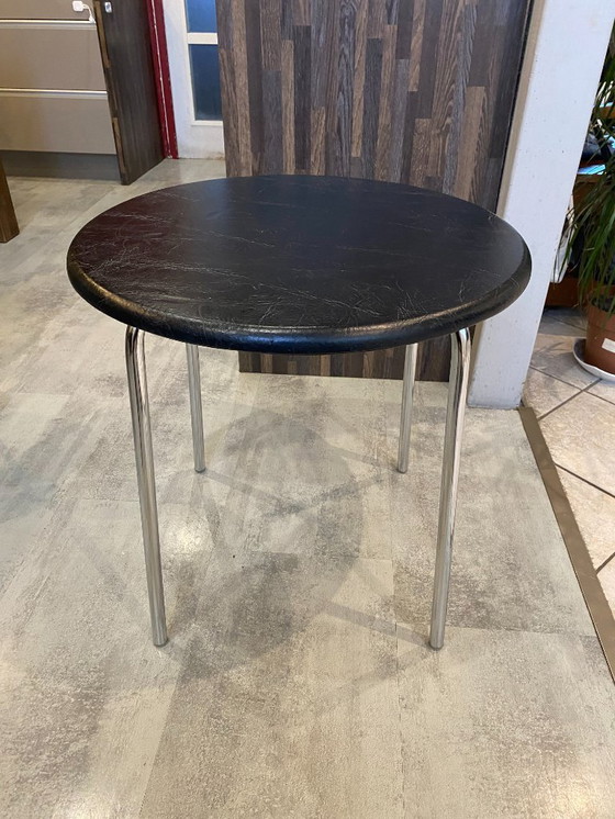 Tavolino laterale vintage in stile Bauhaus cromato e similpelle nera, anni '70