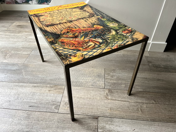 Bellissimo e unico tavolino vintage. Il tavolino presenta una ricetta francese per preparare l'aragosta.