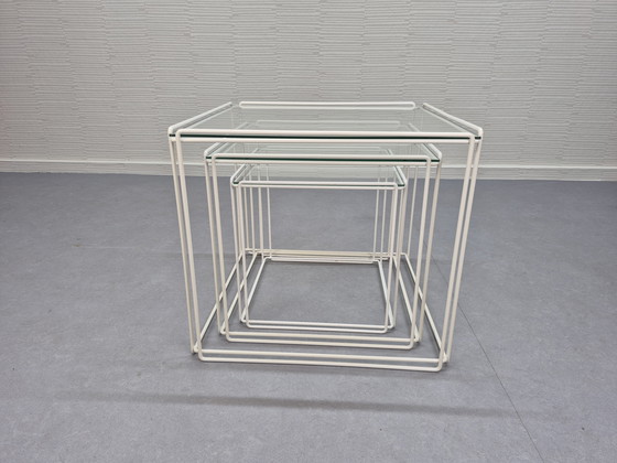 Tre tavolini/tavolini impilabili/tavolino minimalisti di Max Sauze. Modello Isocele degli anni '70. Filo d'acciaio laccato bianco con piano in vetro. In buone condizioni vintage con lievi segni di usura dovuti al tempo.