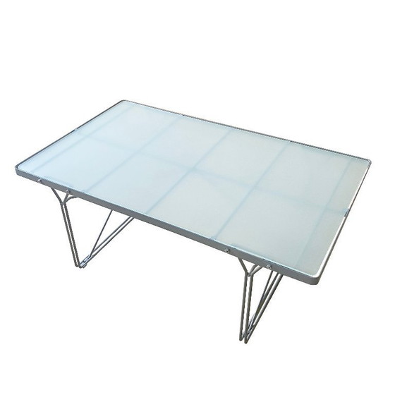 Presenta una struttura reticolare in metallo grigio opaco e un piano in vetro smerigliato, in uno stile sobrio e grafico che riflette l'estetica minimalista del periodo.