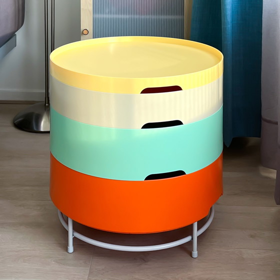 Tavolino Ikea PS 2014 - Designer T. Richardson C. Brill A. Williams. Cerchi un'aggiunta colorata al tuo arredamento? Allora questo tavolino multicolore PS 2014 di Ikea è proprio quello che ti serve! Il vassoio superiore giallo chiaro può essere utilizzato anche come vassoio da portata! Oppure, come ha scritto Ikea stessa nella sua guida del 2014: "Se ci pensi, è più comodo avere più di un vassoio, ad esempio se non vuoi mangiare a tavola. I vassoi insieme formano un grazioso tavolino. Questi ci ricordano le vaporiere asiatiche. Puoi impilarli." Il tutto è in ottime condizioni, perfetto per l'uso quotidiano o come elemento decorativo nel tuo spazio abitativo. Ideale sia per interni moderni che scandinavi! Rendi ogni stanza un luogo allegro con questo tavolino unico. Caratteristiche: Una struttura in metallo grigio chiaro con quattro contenitori impilabili nei colori arancione, verde menta, grigio chiaro e giallo chiaro Dimensioni: Altezza: 45 cm Larghezza: 44 cm Profondità: 45 cm Solo ritiro a mano.