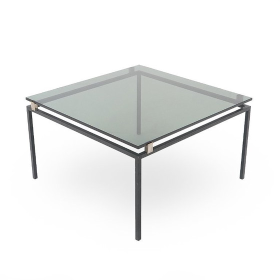 La struttura, realizzata in metallo laccato nero con dettagli in ottone nichelato, sorregge un elegante piano in vetro fumé, segno distintivo del design dell'epoca. Con le sue linee pulite e la sua sobria eleganza, questo tavolino è un pezzo versatile, adatto sia ad interni moderni che classici.