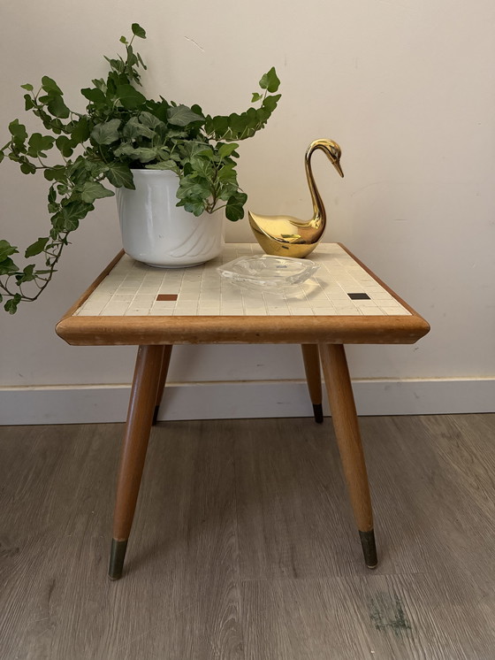 Il tavolo ha quel riconoscibile stile anni '60/'70, probabilmente proveniente dai Paesi Bassi o dalla Germania (questi tipi di tavoli con mosaico/piastrelle erano molto comuni all'epoca). È anche un ottimo portavasi o un tavolino.