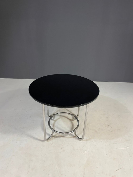 Elegante tavolino Bauhaus disegnato da Robert Slezák negli anni Trenta, caratterizzato da un piano rotondo nero e da una scultorea base tubolare in acciaio con un dettaglio circolare centrale. La struttura cromata è un segno distintivo del primo design modernista, che unisce funzionalità e chiarezza visiva.