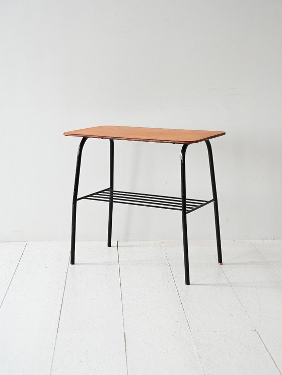 Tavolino vintage con piano in pino massiccio e struttura in metallo nero, tipico del design scandinavo degli anni Sessanta.