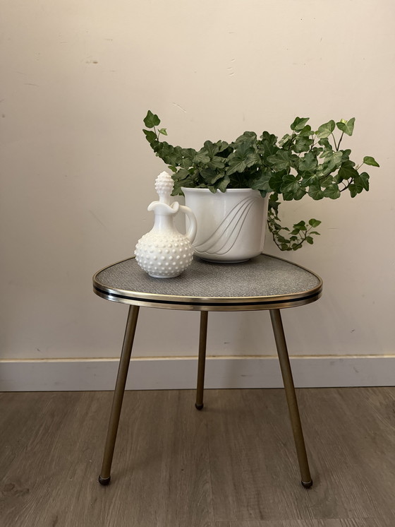 Un tavolino davvero grazioso con una tipica forma anni '50/'60. Il piano ha una finitura grigio screziato con bordo dorato e poggia su sottili gambe in metallo. È perfetto come tavolino o portavasi.