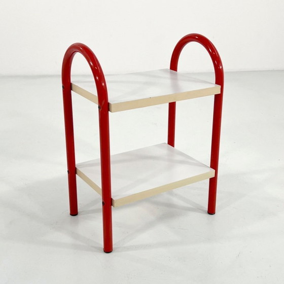 Scopri questo tavolino tubolare degli anni '70, un pezzo unico che conferirà un tocco retrò al tuo arredamento. Con la sua struttura in metallo rosso brillante e i ripiani in legno bianco, incarna perfettamente lo stile audace dell'epoca.