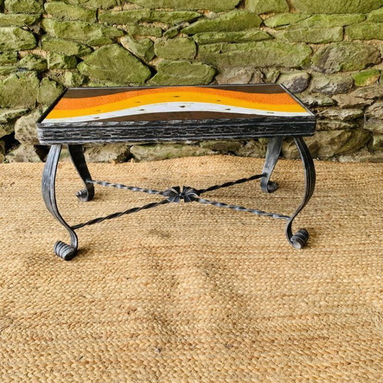 Tavolino vintage in ferro battuto e ceramica, tipico degli anni '60.
