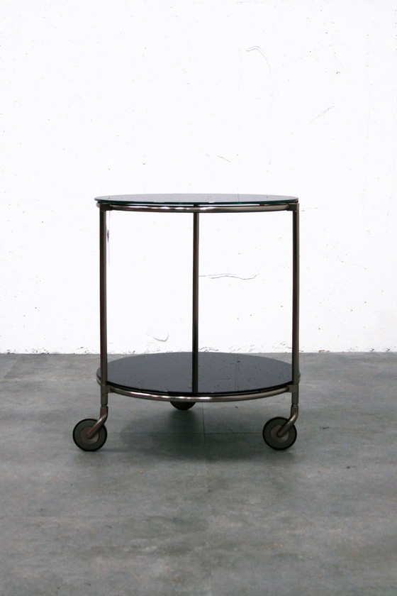 Il tavolino è in buone condizioni vintage, ma presenta alcuni graffi superficiali sui piani in vetro e i gommini sotto il piano in vetro sono leggermente scoloriti. Le ruote sono ancora in ottime condizioni!