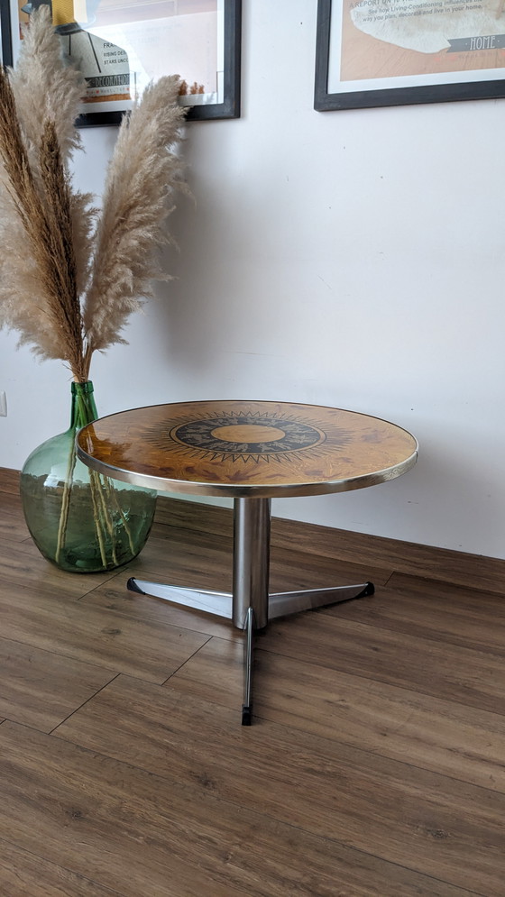 Questo tavolino vintage di Metakor è un'elegante aggiunta a qualsiasi interno. Con il suo piano in vetro ornato da un caratteristico motivo centrale e la robusta base in metallo, unisce stile e funzionalità. Prodotto in Belgio, riflette un design senza tempo e una qualità duratura.