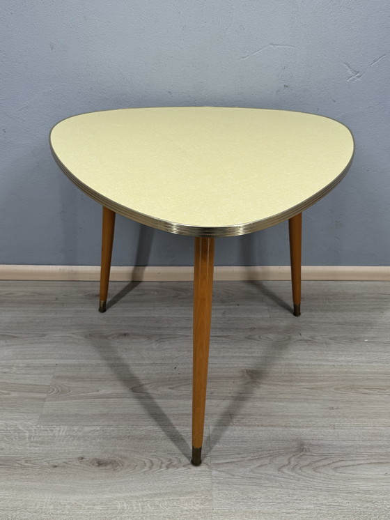 Affascinante tavolino vintage dall'iconica forma triangolare e tre gambe sottili e affusolate. Il piano è realizzato in formica giallo chiaro con un delicato motivo, incorniciato da un bordo in alluminio, una caratteristica tipica del design anni '50. Le gambe in legno con puntali in ottone conferiscono all'insieme un aspetto elegante e arioso.