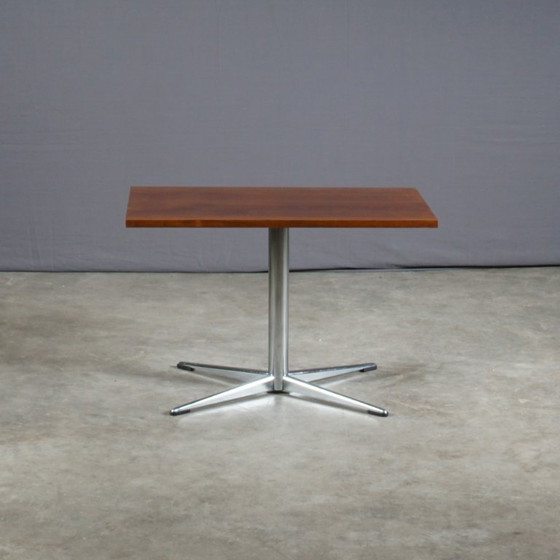 Un bellissimo tavolino dal design elegante e minimalista del marchio tedesco WK Möbel. Il piano in teak ruota su una base a croce cromata. Il tavolino presenta lievi segni di usura sia sul piano che sulla base.