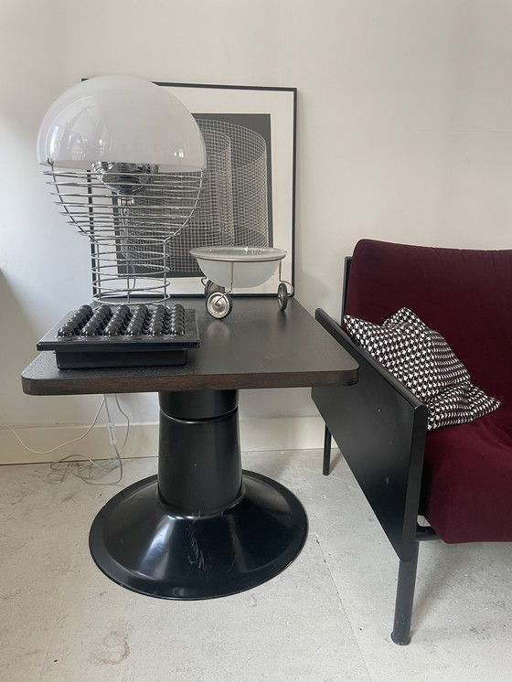 Questo elegante tavolino Saturnus di Yrjö Kukkapuro presenta un'elegante base in metallo nero e un ricco piano in legno marrone. Il suo design è un perfetto esempio di stile moderno di metà secolo, offrendo funzionalità ed estetica. Ideale per aggiungere un tocco di eleganza a qualsiasi spazio abitativo.