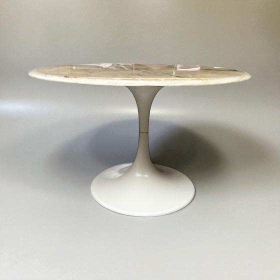 Questo tavolo da pranzo ovale risale agli anni '70 e presenta un tipico design Space Age con un'elegante base a tulipano con una sola gamba.