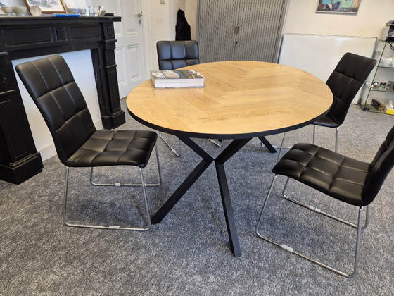 Il tavolo ha un aspetto leggero e moderno grazie alla sua struttura in acciaio minimalista. Si adatta sia ad interni classici che moderni. Le quattro sedie sono incluse.