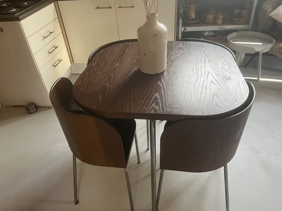 Fai un salto indietro nel tempo con questo affascinante set da pranzo vintage IKEA, perfetto per aggiungere un tocco retrò alla tua cucina o sala da pranzo. Le calde tonalità marroni del legno creano un'atmosfera accogliente, mentre le eleganti gambe in metallo aggiungono un tocco moderno.