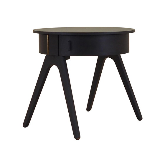 Il tavolo da cucito è stato realizzato negli anni '70, produzione danese. La struttura e le gambe sono in legno massello. Il piano è rivestito in impiallacciatura di rovere. Il tavolo è stato tinto di nero. Lo spazio interno è stato riempito con pratici scomparti. Condizioni: La superficie del mobile è stata rinfrescata. Sono visibili piccoli graffi e segni. I segni d'uso più estesi sono sempre mostrati nelle foto. Prodotto pronto all'uso. *Per motivi di sicurezza, il mobile potrebbe avere le gambe svitate per il trasporto. Il montaggio non dovrebbe essere un problema. In caso di dubbi, contattateci e vi invieremo un video didattico. Dati tecnici: Altezza: 51 cm Larghezza: 54 cm Profondità: 54 cm