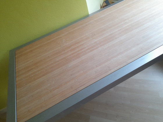 Questo moderno tavolo di design unisce eleganza e funzionalità ed è un complemento perfetto per qualsiasi spazio abitativo contemporaneo. L'elegante struttura in metallo fornisce una base robusta, mentre il piano in bambù crea un look caldo e accogliente. Le gambe hanno due ruote su un lato, le cui gomme possono e devono essere gonfiate. È un tavolo di design, ma purtroppo non ricordo la marca.