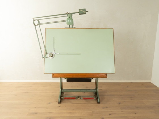 Tavolo da disegno unico degli anni '50 di Nestler, che unisce funzionalità e design industriale classico. La solida struttura in ghisa di un vivace colore verde offre una base indistruttibile. Grazie all'ingegnoso meccanismo con pedali, l'inclinazione del piano di disegno è regolabile in modo continuo. Il mobile è stato accuratamente restaurato e si presenta in buone condizioni vintage. La patina conferisce al tavolo il suo carattere distintivo.