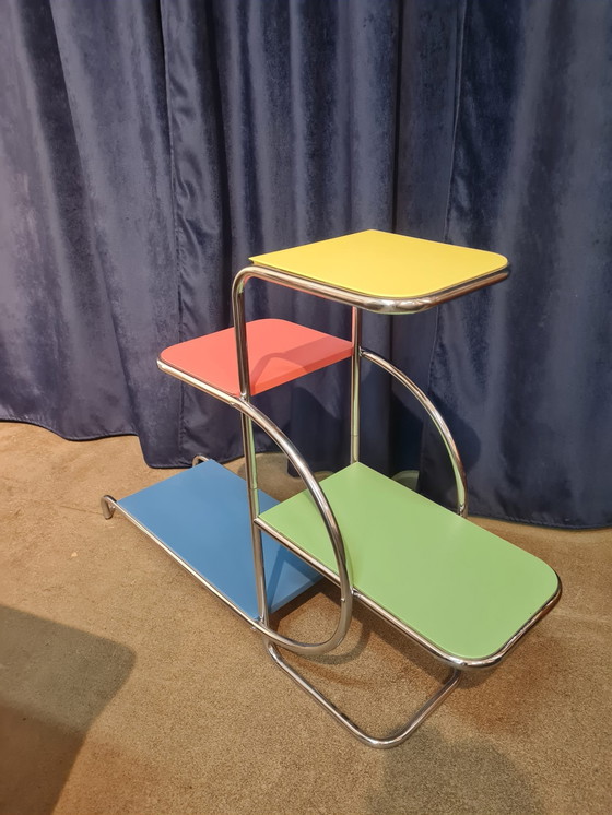 I tavoli da fiori continuano a essere un'aggiunta appropriata al design degli interni moderni. Attualmente possediamo un autentico tavolo cromato degli anni Trenta, in condizioni impeccabili. I ripiani sono stati sottoposti a una fresca verniciatura opaca in morbide tonalità pastello. Questo supporto è versatile e può essere utilizzato sia per esporre fiori sia per esporre altri oggetti.