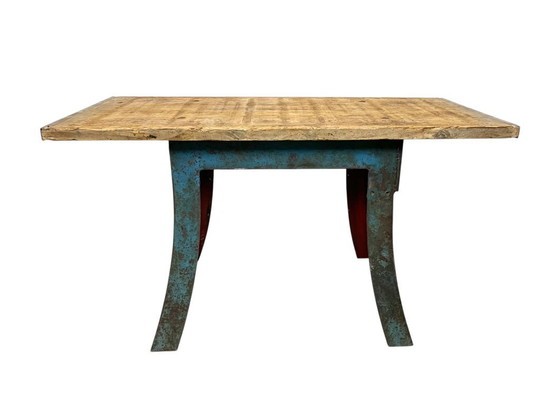 Tavolo industriale realizzato nell'ex Cecoslovacchia negli anni '60. Presenta una base in ferro blu e un solido piano in legno antico con una patina molto bella. Il peso del tavolo è di 80 kg.