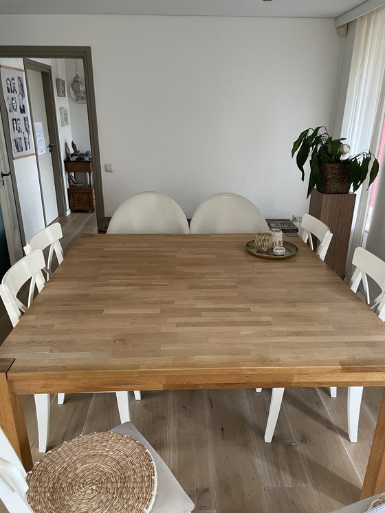 Tavolo da pranzo quadrato in rovere massello. Ha 5 anni. Può ospitare comodamente 8 persone. Dimensioni: 150 x 150 x 76 cm. Usato, presenta quindi alcune macchie sul piano (vedi foto). Questo problema può essere facilmente risolto carteggiando leggermente il tavolo. Trattandosi di legno massello, l'operazione è semplice. Il tavolo è pesante e robusto.