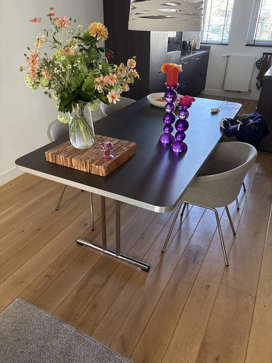 Questo moderno tavolo da pranzo combina un elegante piano nero con una base in metallo color argento, creando un look contemporaneo. L'ampio piano offre ampio spazio per pranzi e cene accoglienti o per lavorare. La robusta struttura in metallo garantisce stabilità e durata, rendendolo la scelta ideale per l'uso quotidiano. Perfetto per un interno moderno.