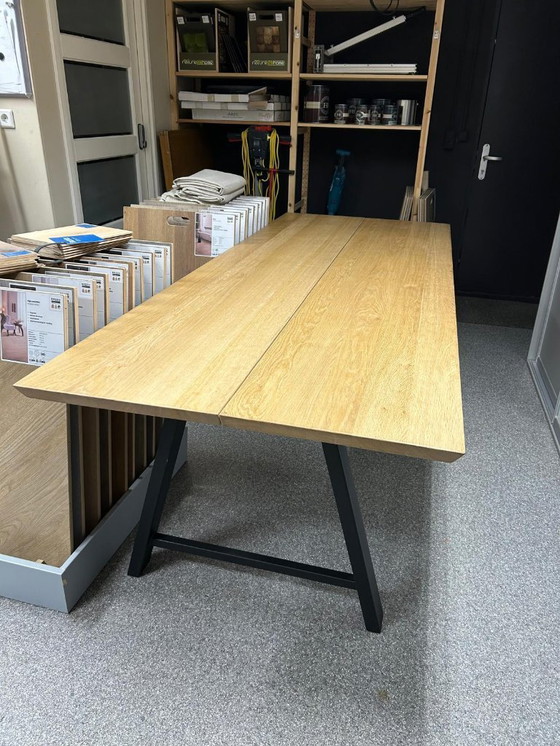 Bellissimo tavolo da pranzo in rovere massello con base in acciaio nero contemporaneo.