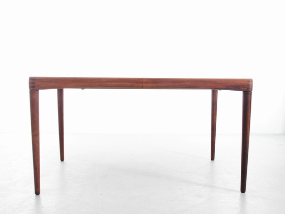 Tavolo da pranzo in palissandro Rio di Henry Walter Klein per Bramin Møbelfarik. Splendidamente rifinito, il telaio in palissandro massello è assemblato tramite giunti dritti. 1 prolunga, che può essere riposta sotto il piano. Può ospitare da 6 a 8 persone. Il piano è stato restaurato. H 72 cm - piano: 135 X 90 cm - lunghezza massima da aperto: 197,5 cm.