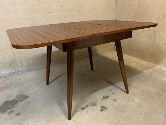 Dal modo in cui sono posizionate le gambe e dall'uso delle cerniere olandesi, brevettate, sappiamo che si tratta di un tavolo Webe, un progetto di Louis van Teeffelen. Anni '60/'70.