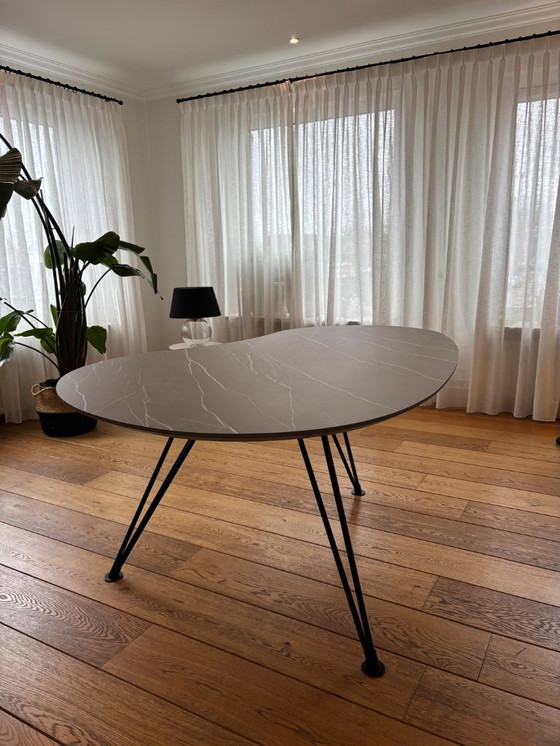 Il tavolo da pranzo Cloudy di Bree's New World è un tavolo da pranzo davvero unico, che emana audacia. La base minimalista permette al piano a forma di nuvola di fluttuare, creando un'atmosfera piacevolmente ariosa.