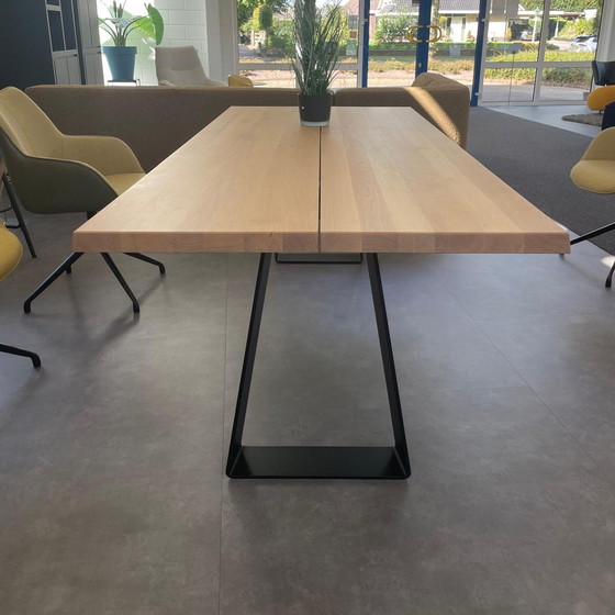 Tavolo da pranzo Crossover di Bree's New World. Un robusto tavolo da pranzo in legno massello con struttura in metallo nero. Il bordo smussato crea simmetria. Questo tavolo da pranzo si adatta perfettamente a un interno moderno, rustico o industriale! 1 tavolo da pranzo Crossover. Dimensioni: 220x95x75 cm. Colore: Rovere massello, finitura bianca. Struttura: Epossidica nera.