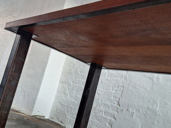 Un tavolo da pranzo brutalista di metà secolo, unico o rarissimo, con piano in teak massello spesso 4 cm e base in acciaio patinato. Le gambe possono essere svitate per facilitarne il trasporto.