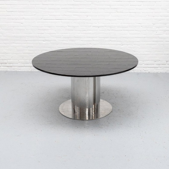 Tavolo da pranzo Cidonio, disegnato nel 1968 da Antonia Astori per Driade. Acquistato a Bruxelles negli anni Settanta, questo esemplare è realizzato con base e colonna in acciaio inox, abbinata a un piano in granito nero. Raro in questa versione con piano in granito.