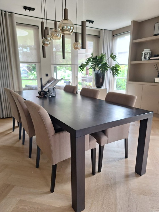 Tavolo da pranzo di dimensioni 260 x 100 cm. colore cacao. Piano spesso 6cm, gambe quadrate e larghe 9cm, altezza tavolo 79cm. Sembra nuovo. Nuovo prezzo nel novembre 2014 € 2.000.