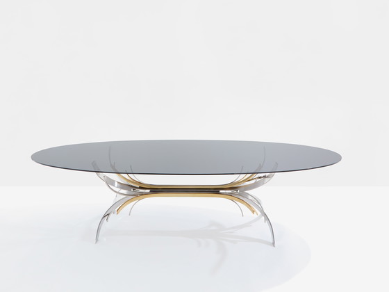 Questo tavolo da pranzo è una rara variante dell'iconico modello Gerbe dell'artista francese Maria Pergay, risalente al 1970. È caratterizzato da un gruppo di lame piatte e curve in acciaio lucido, acciaio spazzolato e ottone lucido, sormontate da una lastra ovale in vetro fumé grigio. Le curve sinuose dei materiali evocano fluidità e movimento, aggiungendo un elemento dinamico e scultoreo al pezzo, mentre la sua superficie liscia in vetro fumé rifinisce la struttura del pezzo e continua a giocare con la luce. Testimone dell'ingegno e del talento di Maria Pergay, questo tavolo da pranzo porterà un tocco di eleganza unico a qualsiasi interno. Il tavolo è stato restaurato e si trova in condizioni straordinarie. Il piano in vetro è stato recentemente sostituito e potrebbe essere ancora più grande. Esempi di piani in vetro più grandi si possono trovare sul sito web di Wright, dove un tavolo Gerbe con piano più grande è stato venduto per 126.000 dollari nel settembre 2005, o sul sito web di Demisch Danant, con un piano in vetro rettangolare extra-large. Maria Pergay (1930 - 2023) è una designer di mobili francese di origine moldava, rinomata a livello internazionale per le sue creazioni innovative che domano l'acciaio, un materiale che considera "prezioso come il legno più pregiato". Verso la fine degli anni '60, Pergay si è distinta dai suoi contemporanei con il suo approccio innovativo che combina linee pulite e materiali grezzi per creare pezzi funzionali e artistici. Nel corso dei decenni, Maria Pergay è diventata una figura di spicco nel campo creativo, in particolare attraverso le sue creazioni iconiche (ad esempio, questo tavolo Gerbe o le applique Totem) che hanno contribuito a ridefinire gli standard del design contemporaneo. Oggi, la sua firma metallica continua a ispirare e affascinare gli appassionati di arredamento di tutto il mondo. Bibliografia: "Maria Pergay: tra idee e design", Suzanne Demisch, pagine 46 e 49.