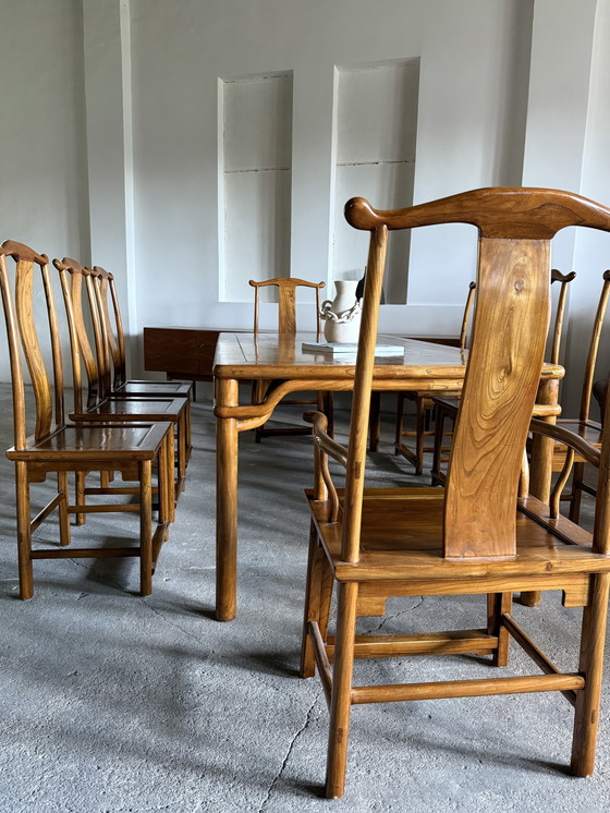 Bellissimo set da pranzo solido, di alta qualità, composto da un grande tavolo da pranzo da 220 cm e otto sedie (due con braccioli e sei senza), prodotto in Cina negli anni '60.