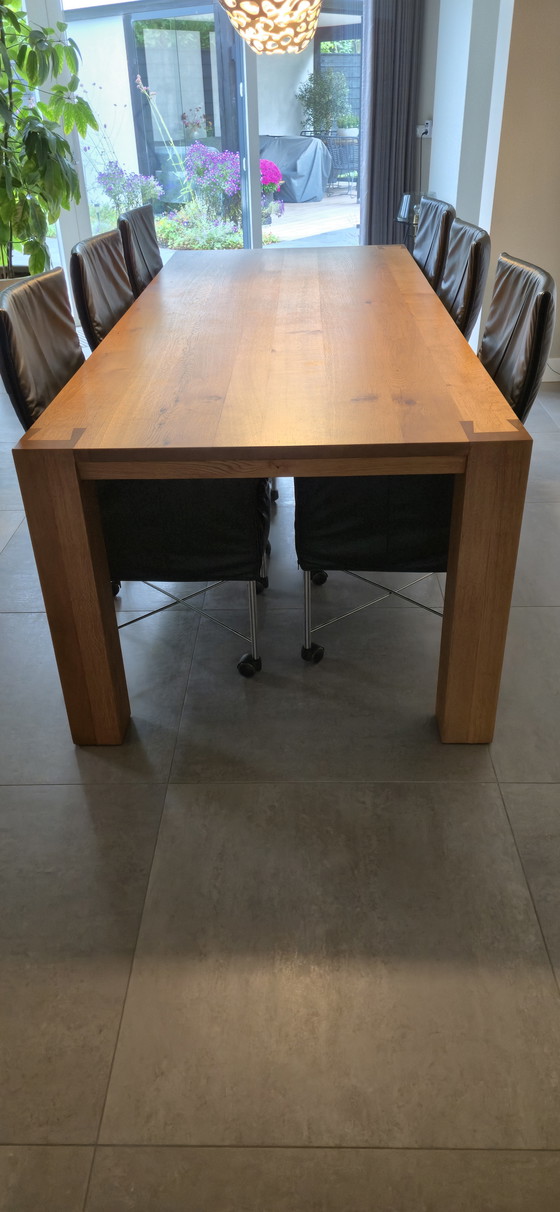 Questo elegante tavolo da pranzo in rovere aggiunge un tocco caldo e moderno a qualsiasi sala da pranzo. Il suo design robusto offre ampio spazio per cene accoglienti con la famiglia e gli amici. Le sedie rivestite in pelle abbinate offrono ulteriore comfort ed eleganza.