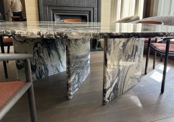 Dona un tocco di lusso e personalità ai tuoi interni con questo splendido tavolo da pranzo in marmo Cipollino. L'esclusivo motivo ondulato e le naturali variazioni di colore rendono ogni tavolo un vero e proprio elemento d'arredo.