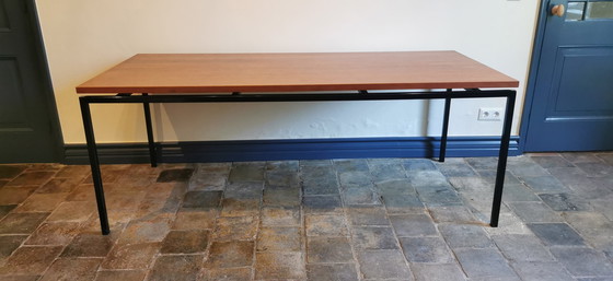 Vendo questo tavolo perché non si adatta più al nostro arredamento dopo il trasloco. È un tavolo fatto a mano, disegnato da Pastoe e Cees Braakman, della serie giapponese, in cui il piano sembra fluttuare sopra la struttura. Il piano è in rovere massello. La struttura in acciaio è verniciata a polvere nera. Le dimensioni sono 200x90x76,5 cm. Il tavolo è in buone condizioni vintage, con alcuni graffi sulla struttura. Il piano è stato recentemente oliato. Grazie al piano robusto e solido e al legno duro, è facile da restaurare, anche dopo un uso intensivo (ad esempio, con i bambini).