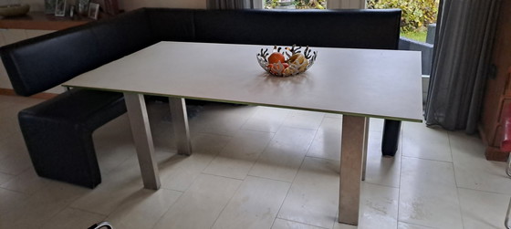 La panca è realizzata in pelle nera e il tavolo ha un piano in vetro con piano in ceramica. È facile da pulire e resistente ai graffi e all'umidità.