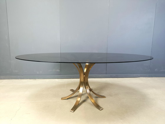 Splendido tavolo da pranzo in ottone massiccio con un grande piano ovale in vetro fumé. Design senza tempo, con un tocco anni Settanta. Anni '70 - Francia Buone condizioni Altezza: 75 cm Larghezza: 220 cm Profondità: 125 cm Rif: 25041103 Possiamo anche spedire solo la base, risparmiandoti molti costi di spedizione - richiedi informazioni. *Tutte le immagini fanno sempre parte della descrizione, i nostri articoli vintage sono sempre soggetti alla normale usura dovuta all'età, solo i difetti principali saranno specificati nella descrizione.