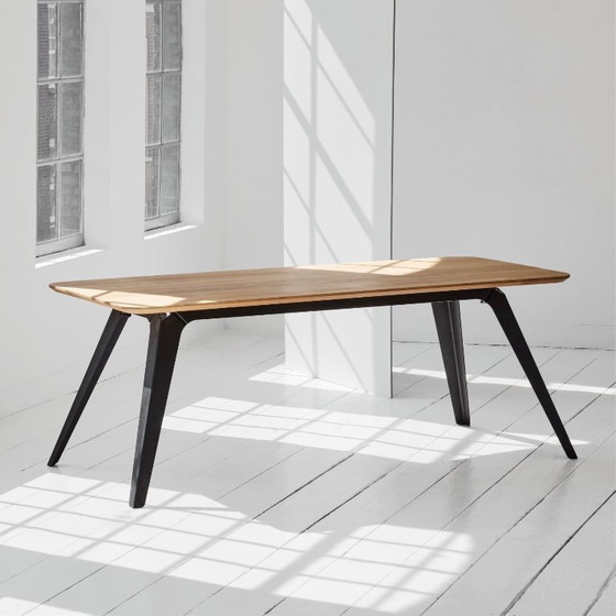 'Fold', un tavolo in acciaio tagliato e piegato al laser con piano in rovere massello.