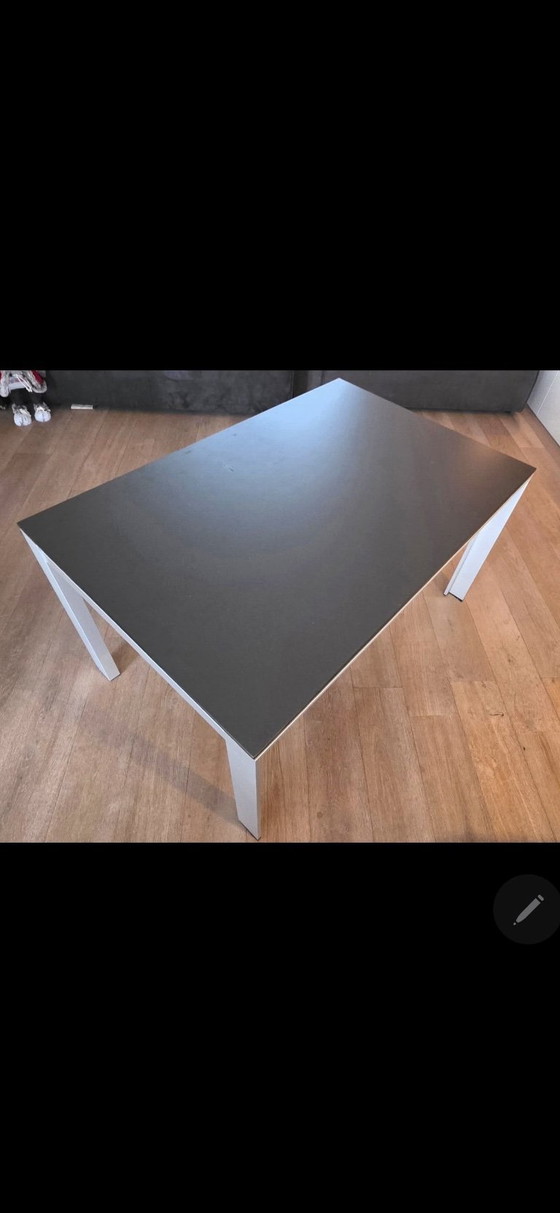 Il tavolo può ospitare da 4 a 6 persone. Il piano in Trespa nero è in buone condizioni e le gambe sono in alluminio.