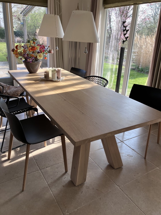 Bellissimo e robusto tavolo da pranzo Lens/van Rossum in legno massello di rovere. Costruzione di altissima qualità. Le ultime due foto sono tratte da una brochure e mostrano chiaramente la struttura. Le dimensioni sono 250 x 100 cm, con una distanza tra le gambe di 168 cm.